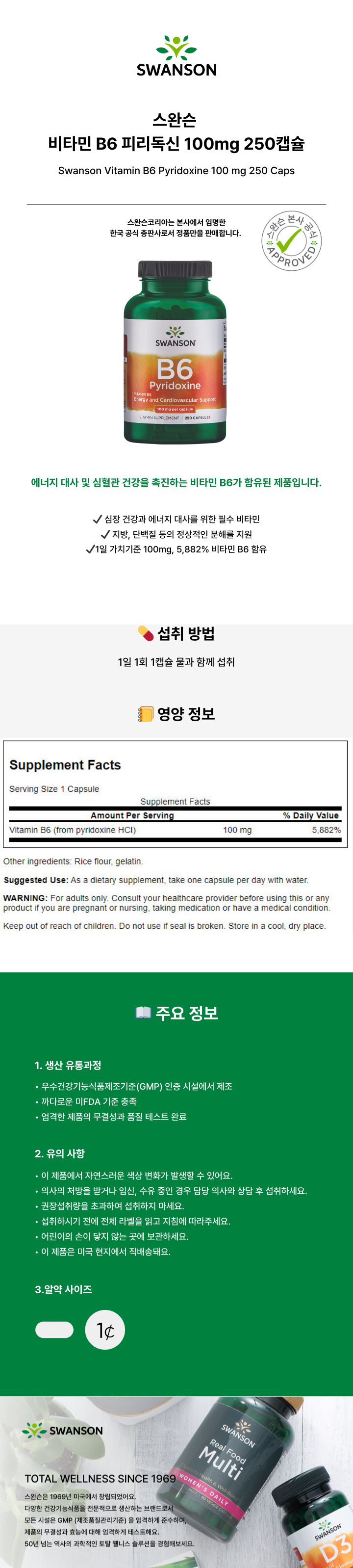 [B2B]스완슨 비타민 B6 피리독신 100mg 250캡슐 250일분